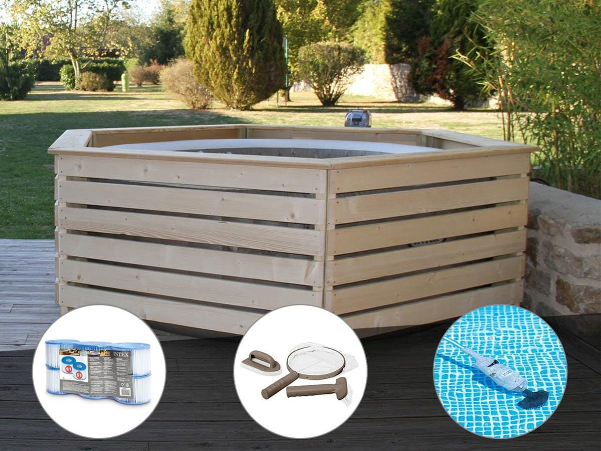 pack spa gonflable intex purespa sahara rond bulles 4 places habillage en bois aquazendo 6 filtres kit d entretien aspirateur leroy merlin
