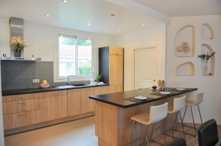 grande cuisine gris clair et bois avec bel ilot central et meubles tournes vers le salon pou cuisine grise et bois cuisine grise clair peinture meuble cuisine