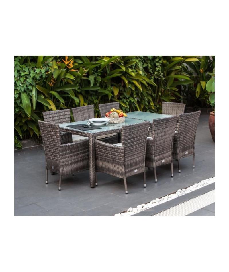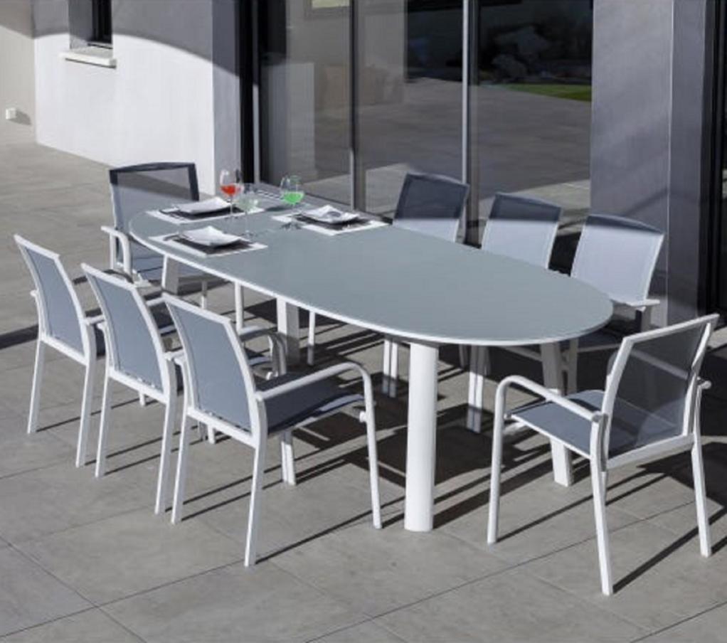 ensemble repas de jardin 8 personnes table 190x90cm 8 fauteuils plateau verre trempe et structure resine tressee gris leroy merlin
