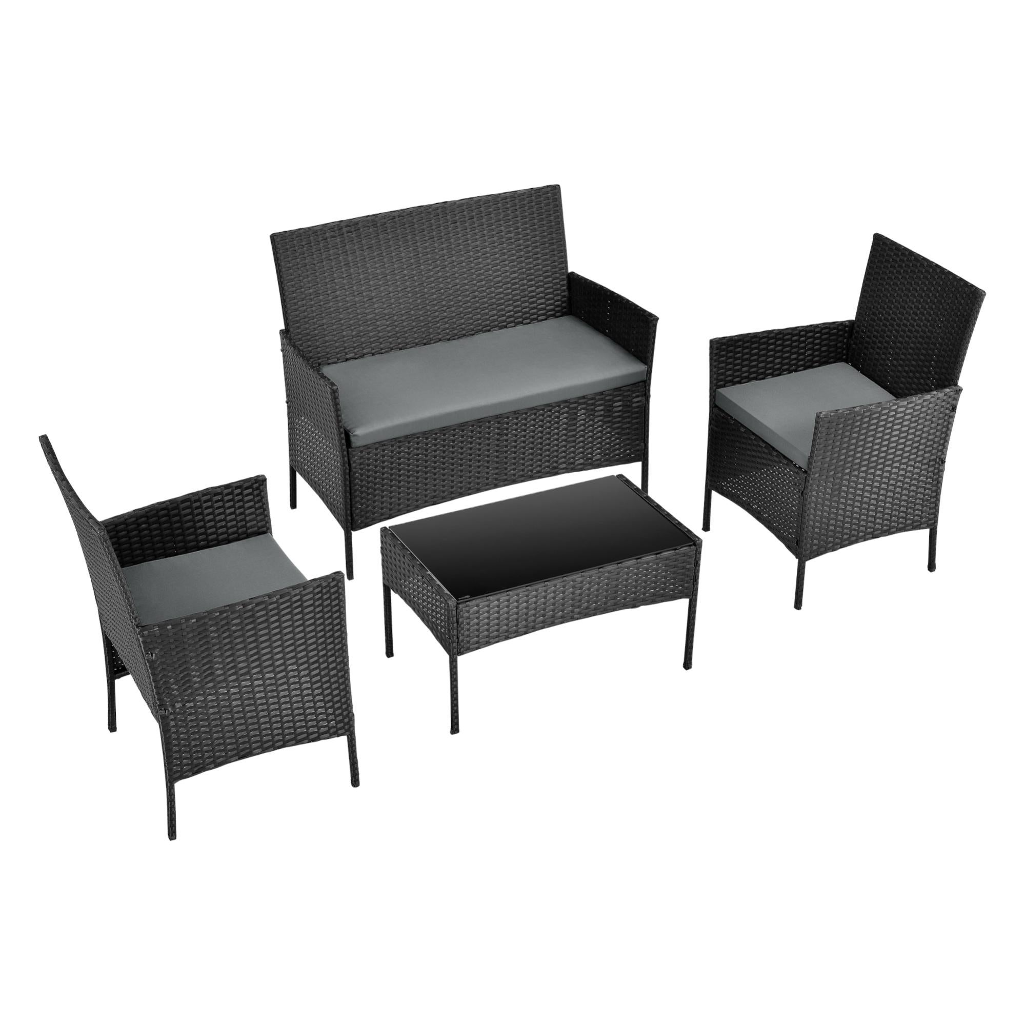 salon de jardin design table basse plateau en verre canape fauteuils set de 4 meubles exterieurs pour 4 personnes coussins a housse amovible polyester acier polyrotin noir gris fonce en casa leroy merlin