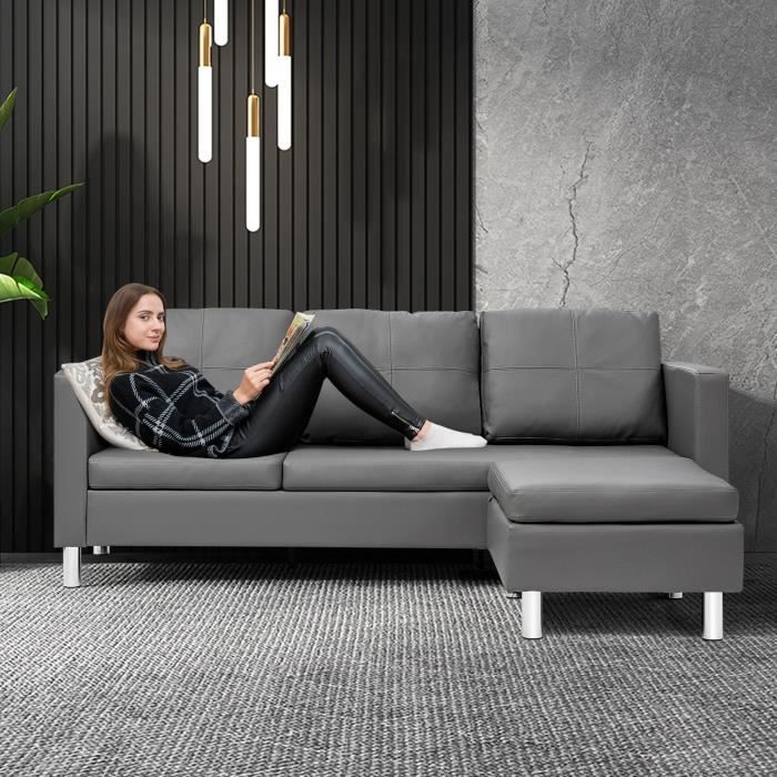 costway canape d angle 3 places convertible avec meridienne reversible en cuir pu gris 188x62x60cm pour salon appartement sejour cdiscount maison