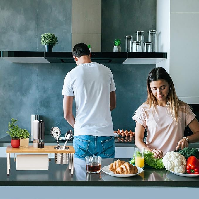 relaxdays etagere de cuisine pour le plan de travail support a sopalin corbeille a couverts bambou naturel argente amazon fr cuisine maison