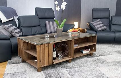 vinterior table basse xxl en caisses a pommes avec plateau en verre transparent aspect brillant caisse a fruits plaquee en bois table rustique 155 x 80 x 50 cm amazon fr cuisine maison