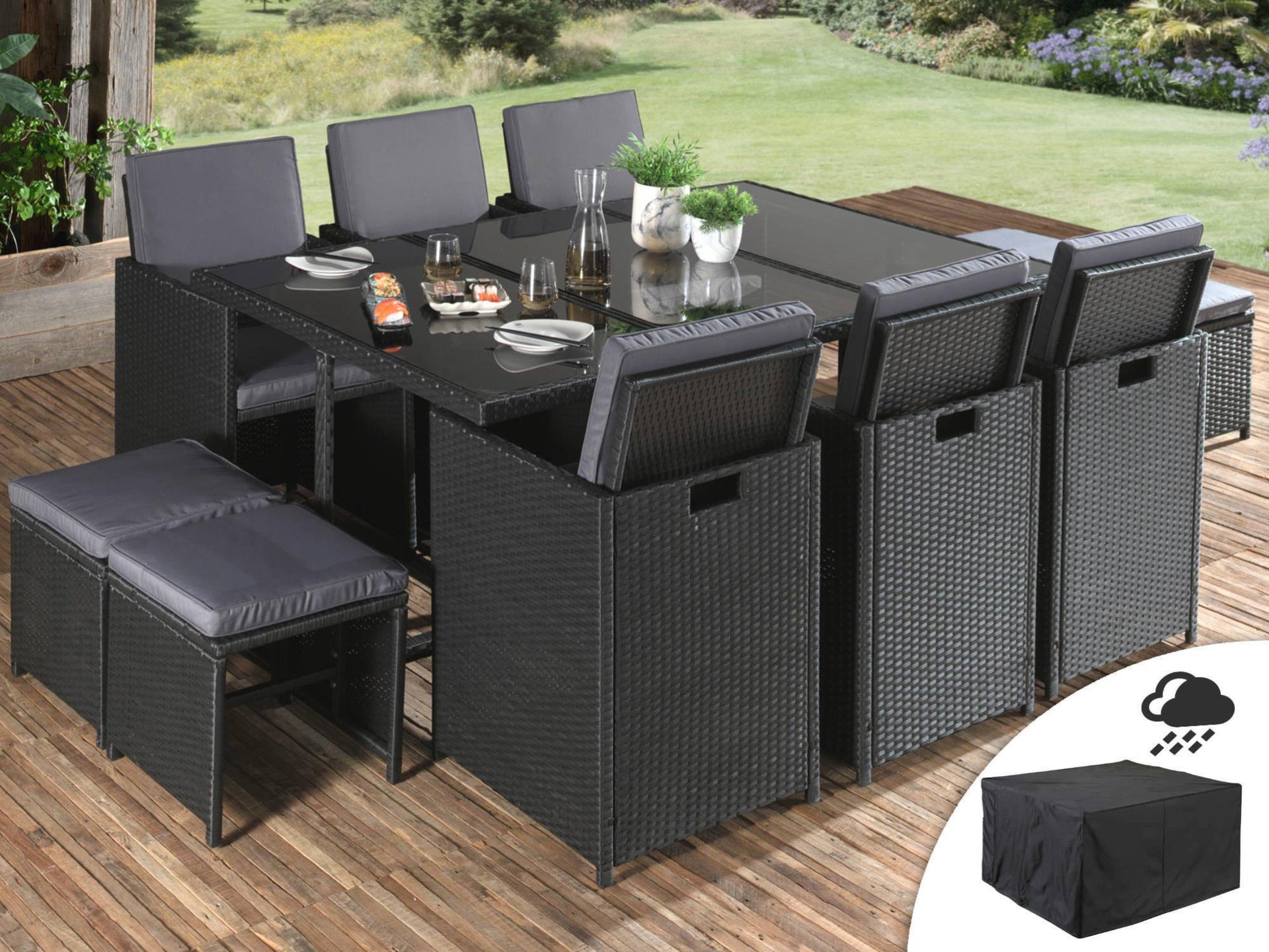 sophia salon de jardin encastrable 10 places en resine tressee noir avec coussins gris housse de protection leroy merlin
