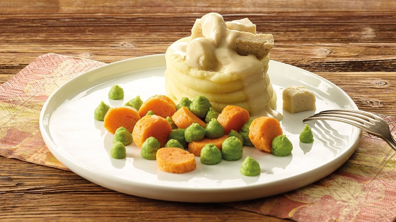 vol au vent de pommes de terre au poulet et champignons sous forme de puree
