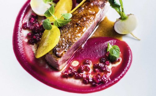 recette de canette rotie puree de betterave au vinaigre balsamique navets et copeaux de betterave couleur