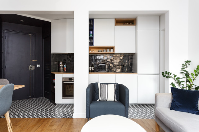 cuisine ouverte sur la salle a manger ilot central coloris blanc gris perle bleu pastel bois clair carrelage gris clair carrelage gris cuisine blanc laque