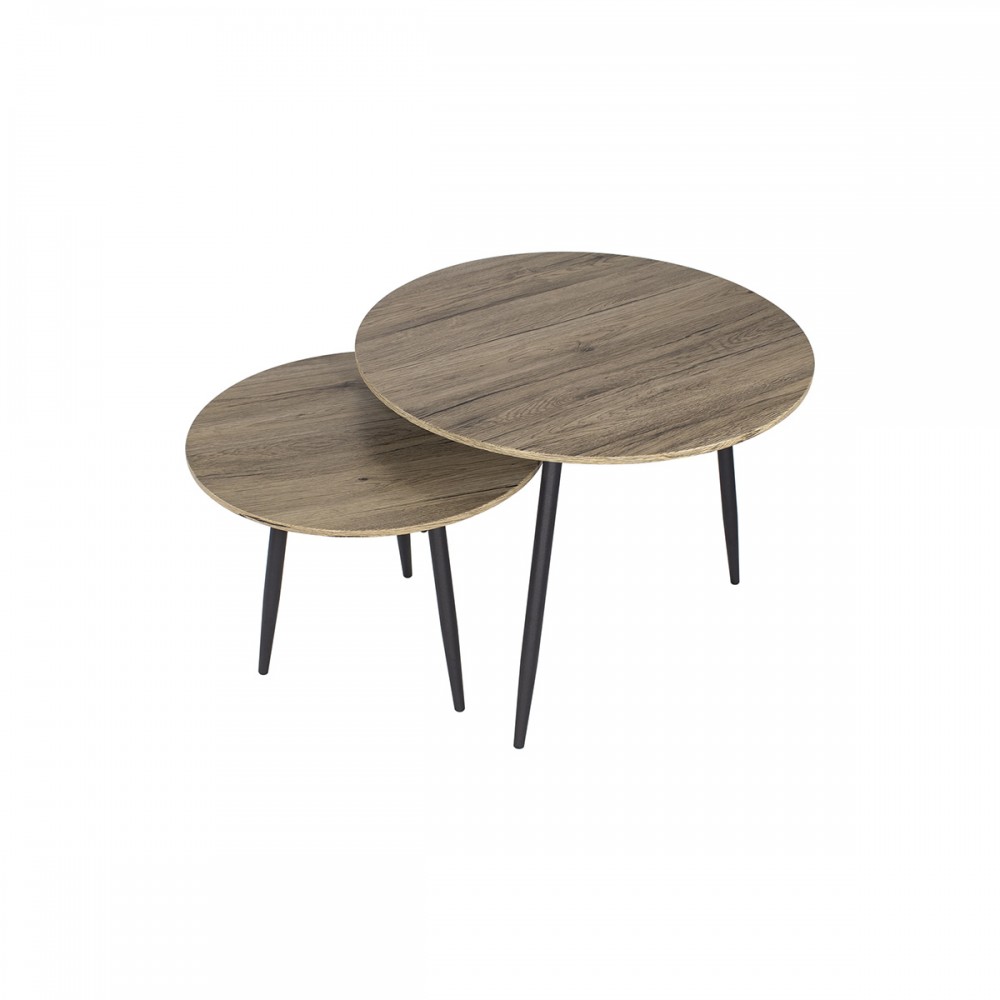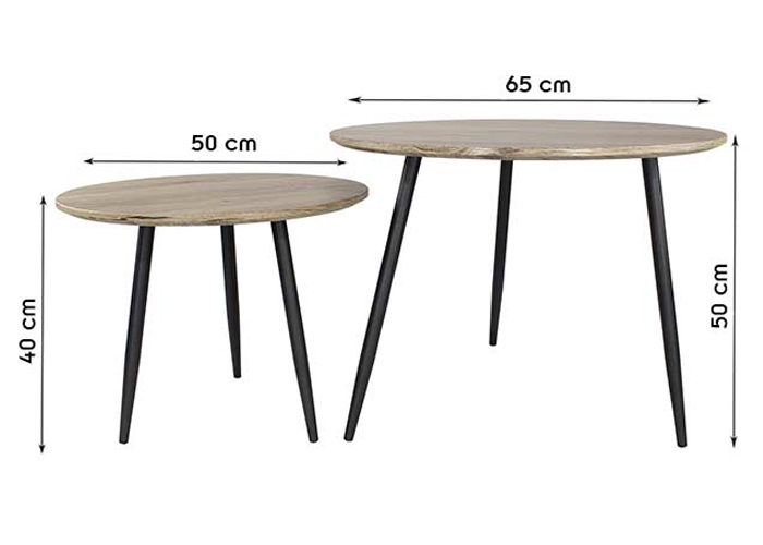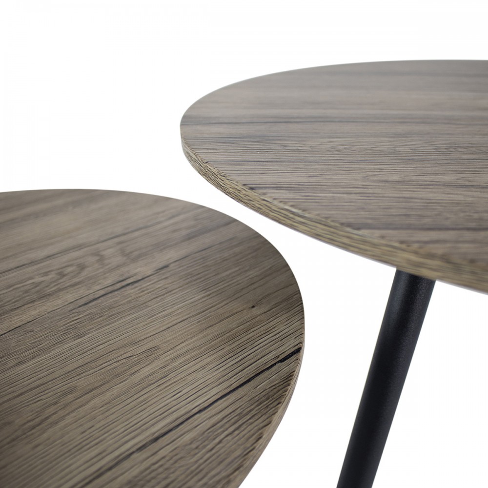 2 tables basses gigognes plateau aspect bois et 3 pieds metal noirs