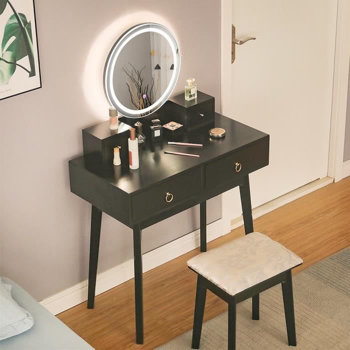 coiffeuse noire avec miroir a lumieres led et tabouret luminosite reglable 4 tiroirs cdiscount maison