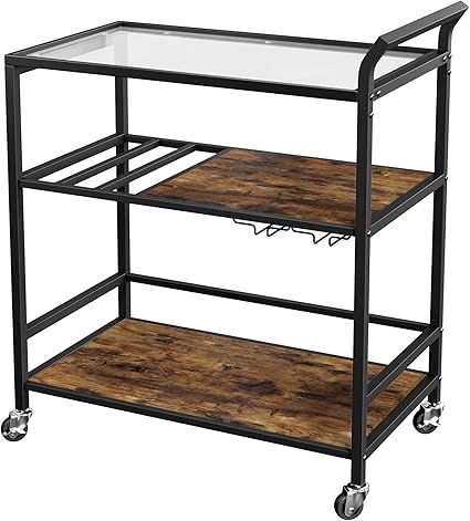 vasagle desserte sur roulettes chariot de bar avec etagere supports pour verres et bouteilles dessus en verre 75 x 40 x 86 cm style industriel marron rustique et noir lrc086b01 amazon fr cuisine