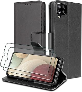 wuglrz coque pour samsung galaxy a12 m12 avec 2 pieces verre trempe protection ecran luxe pu cuir portefeuille housse avec magnetique flip protection case noir amazon fr high tech