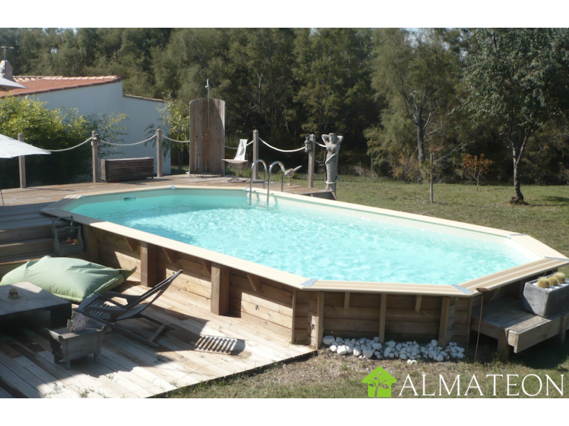 piscine en bois ubbink octogonale allongee azura 400 x 750 cm hauteur de 130 cm liner coloris beige almateon